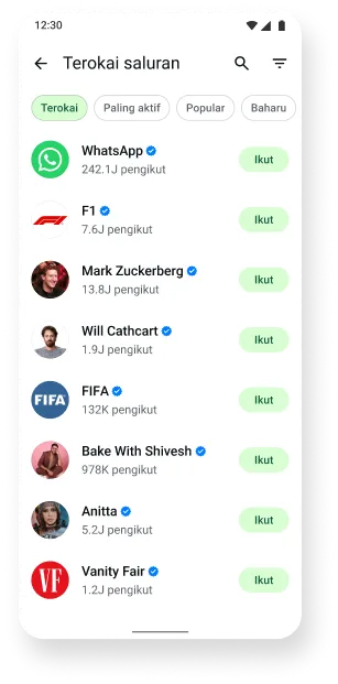 Terokai Direktori Saluran dan ikuti saluran tentang topik yang anda minati, sama ada hal terkini tentang pasukan sukan kegemaran anda atau menu istimewa harian daripada kedai roti di kawasan setempat anda. Dapatkan akses eksklusif kepada lebih banyak perkara yang anda sukai dengan melanggan saluran kegemaran anda*.