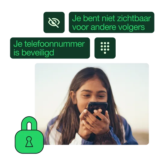 Alleen jij kunt zien welke kanalen je volgt. Je telefoonnummer blijft privé en alleen beheerders die jou hebben opgeslagen als contact kunnen je nummer zien.