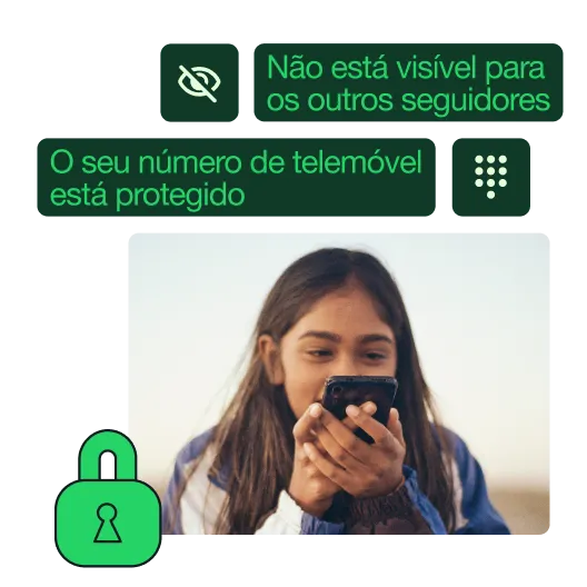 Mais ninguém pode ver os canais que segue. O seu número de telemóvel permanece privado e só os administradores que têm o seu contacto podem vê-lo/a.
