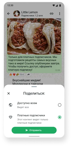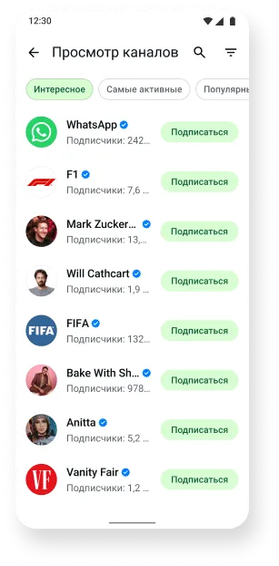 Посмотрите каталог и подпишитесь на каналы, которые публикуют контент на актуальные для вас темы. Следите за новостями о любимой спортивной команде, предложениями дня от местной пекарни и не только. Вы также можете оформить платную подписку на понравившиеся каналы, чтобы получить эксклюзивный доступ к дополнительному контенту*.