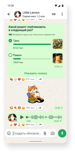Делитесь с аудиторией скачиваемыми пользовательскими стикерами, рассказывайте новости в голосовых сообщениях, узнавайте мнения подписчиков в опросах и не только.