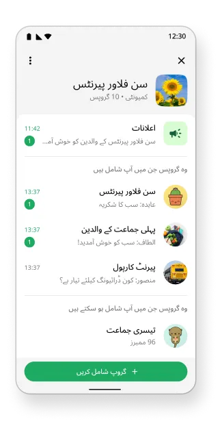 WhatsApp کمیونٹیز متعلقہ گروپس کو ایک چھت کے نیچے جوڑتی ہے تاکہ ایڈمنز گروپ چیٹس کا آسانی سے انتظام کر سکیں، اعلانات کے گروپ کے ذریعے ایک ساتھ ہر کسی تک رسائی کر سکیں، اور اپنی گفتگوؤں کو مرکوز اور بامعنیٰ رکھ سکیں۔