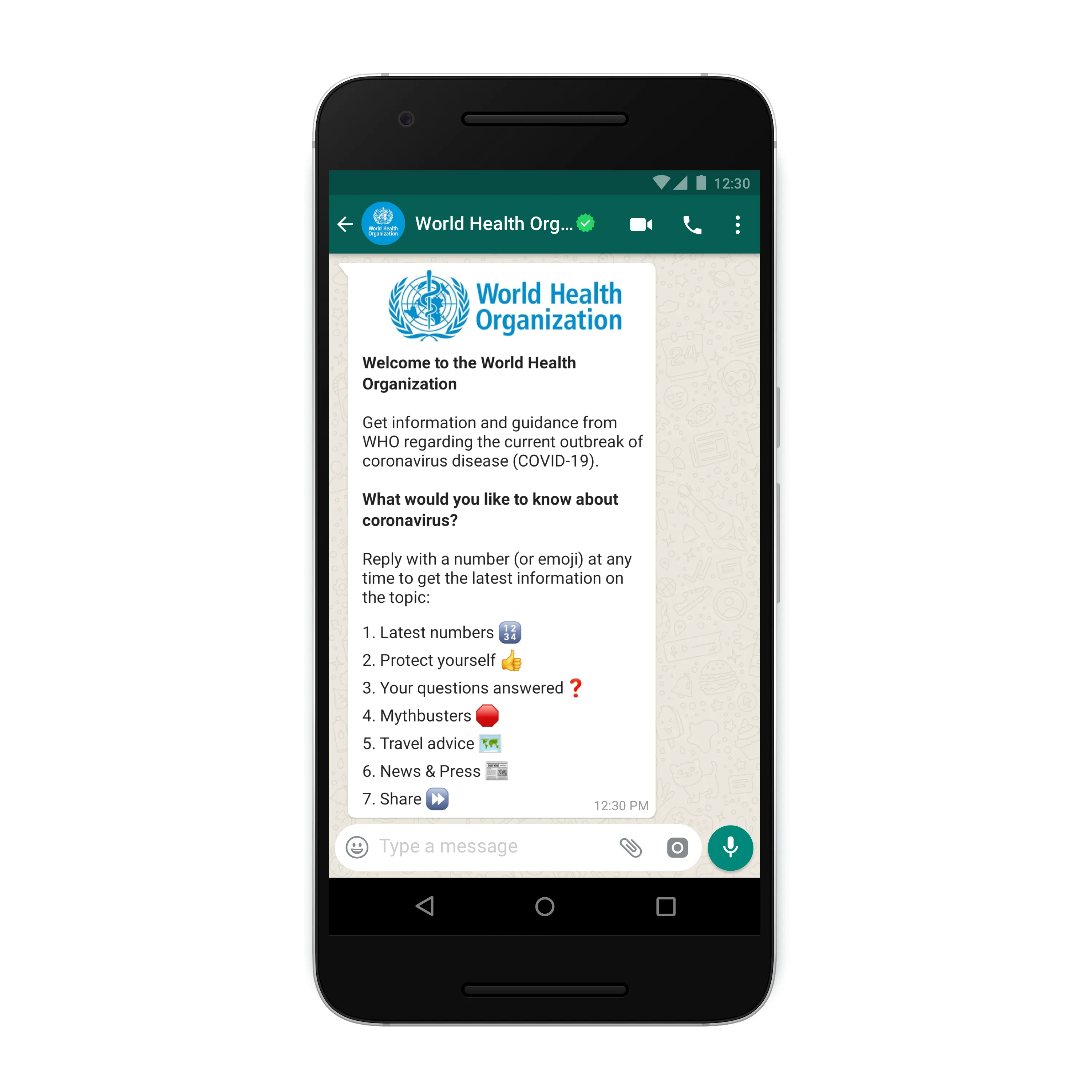 Today we are extremely pleased to announce the launch of the World Health Organization’s Health Alert on WhatsApp. The new service, which is free to use, has been designed to answer questions from the public about Coronavirus, and to give prompt, reliable and official information 24 hours a day, worldwide. This will also serve government decision-makers by providing the latest numbers and situation reports.