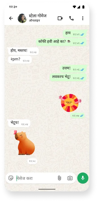 तुम्ही वैयक्तिक आणि ग्रुप चॅटमध्ये स्टिकर ॲक्सेस करू शकता. स्टिकर पाहण्यासाठी आणि वापरण्यासाठी, चॅट उघडा, त्यानंतर स्टिकर आयकॉनवर टॅप करा. तुम्ही त्यावर टॅप करताच ते पाठवले जाईल. WhatsApp स्टिकर स्टोअरमधील सुचवलेली स्टिकर पॅक कोणत्याही डाउनलोड केलेल्या पॅकच्या खाली दाखवली जातात. तुम्ही यांपैकी कोणतीही स्टिकर पाठवण्यासाठी त्यांवर टॅप करू शकता किंवा संपूर्ण पॅक पाहण्यासाठी स्टिकर पॅक जोडा यावर टॅप करू शकता.