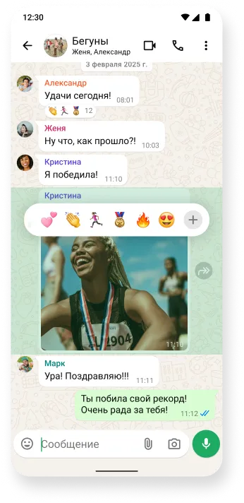 Вы можете реагировать на сообщения в личных и групповых чатах, используя смайлики. Все реакции на сообщение можно просмотреть, нажав на смайлик с реакциями под ним. Чтобы отреагировать на сообщение, нажмите и удерживайте сообщение, а затем нажмите смайлик, чтобы отреагировать, или нажмите "Добавить" (знак плюса в круге), чтобы выбрать смайлик с клавиатуры.