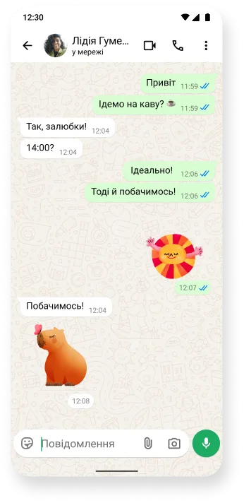 Наклейки доступні в особистих і групових бесідах. Щоб переглянути й використати наклейку, відкрийте бесіду, а потім торкніться значка «Наклейка». Наклейку буде надіслано, щойно ви її торкнетеся. Під кожним завантаженим набором наклейок відображаються рекомендовані набори наклейок із Магазину наклейок WhatsApp. Ви можете торкнутися будь-якої із цих наклейок, щоб надіслати її, або торкнутися «Додати набір наклейок», щоб переглянути весь набір.