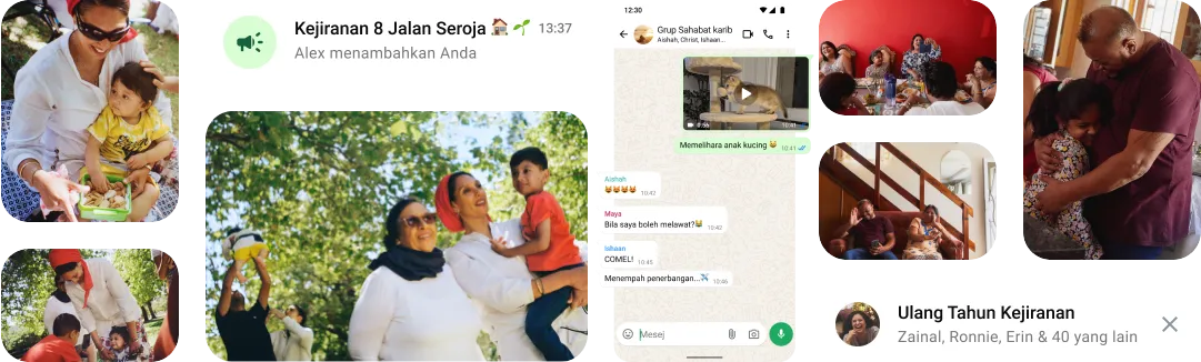 Daripada sembang harian dengan rakan karib hingga bertegur sapa dengan rakan sekerja, pemesejan kumpulan WhatsApp membantu anda terus berhubung dengan insan terdekat. Pemesejan kumpulan WhatsApp adalah percuma*, sulit dan mempunyai ciri yang anda perlukan untuk menjadikan perbualan lebih mudah dan lebih produktif.