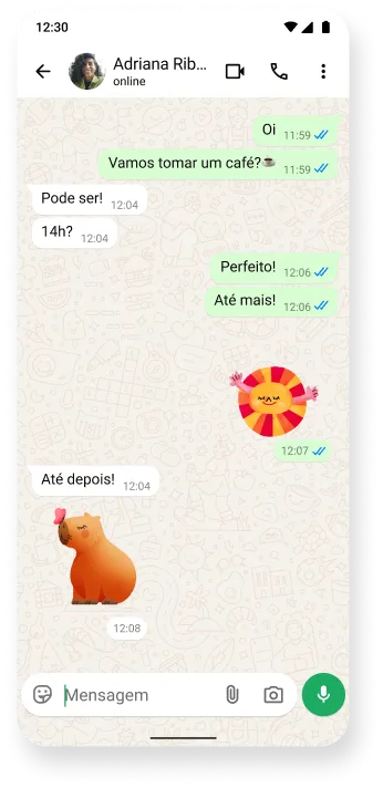 Você pode acessar figurinhas em conversas individuais ou em grupo. Para encontrar e usar as figurinhas, abra uma conversa e toque no ícone de figurinhas. Assim que você tocar na figurinha, ela será enviada automaticamente. O WhatsApp exibe sugestões de pacotes de figurinhas da Loja de Figurinhas abaixo dos pacotes baixados. Toque em uma dessas figurinhas para enviá-la ou em Adicionar pacote de figurinhas para acessar o pacote completo.