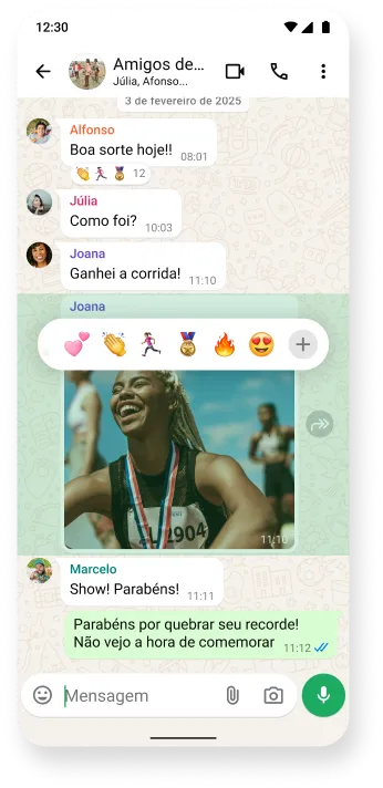 Use qualquer emoji para reagir a mensagens e compartilhar seus pensamentos de forma fácil e instantânea.