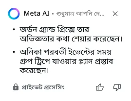 না পড়া মেসেজ যদি জমে যায়, তাহলে Meta AI চটপট সেগুলোর সারাংশ দিতে পারে, যাতে আপনি সহজেই আবার কথোপকথনে ফিরে যেতে পারেন। Meta বা WhatsApp আপনার মেসেজ না পড়েই, প্রাইভেট প্রসেসিং প্রযুক্তির সাহায্যে Meta AI-কে তা প্রসেস করার অনুমতি দেয়।