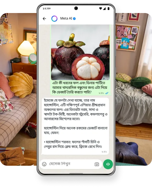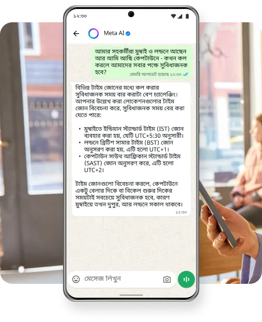 টেক্সট বা ভয়েস যেভাবে খুশি Meta AI-এর সাহায্য নিন—তা গণিতের সমস্যার সমাধান করা হোক বা ফটো এডিট করা বা গ্রুপ চ্যাটে সবাই একমত হবেন এমন কোনো রেস্টুরেন্ট খুঁজে বের করা যাই হোক না কেন।