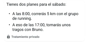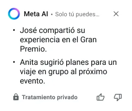 Cuando los mensajes no leídos comienzan a acumularse, Meta AI puede ayudarte a resumirlos rápidamente para que puedas retomar la conversación al instante. La tecnología de tratamiento privado permite a Meta AI procesar tus mensajes sin que Meta ni WhatsApp puedan leerlos.