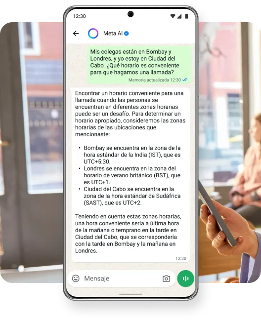 Obtén ayuda con Meta AI, ya sea que prefieras texto o voz, desde resolver un problema de matemáticas, hasta editar una foto o encontrar un restaurante en el que todos en el grupo estén de acuerdo.
