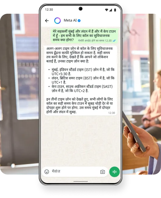 टेक्स्ट या वॉइस प्रॉम्प्ट के ज़रिए Meta AI से मदद पाएँ —फिर चाहे, आपको गणित का सवाल हल करना हो, फ़ोटो एडिट करनी हो या कोई ऐसा रेस्टोरेंट ढूँढना हो जहाँ जाने के लिए ग्रुप चैट का हर मेंबर अपनी सहमति दे सकता हो.