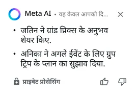 नहीं पढ़े गए मैसेज की संख्या बहुत ज़्यादा हो जाने पर, Meta AI तुरंत उन मैसेज का सारांश तैयार करने में आपकी मदद कर सकता है, ताकि आप दोबारा आसानी से चैट शुरू कर सकें. प्राइवेट प्रोसेसिंग टेक्नोलॉजी के ज़रिए Meta AI आपके मैसेज को इस तरह से प्रोसेस करता है कि Meta या WhatsApp उन मैसेज को नहीं पढ़ सकते.