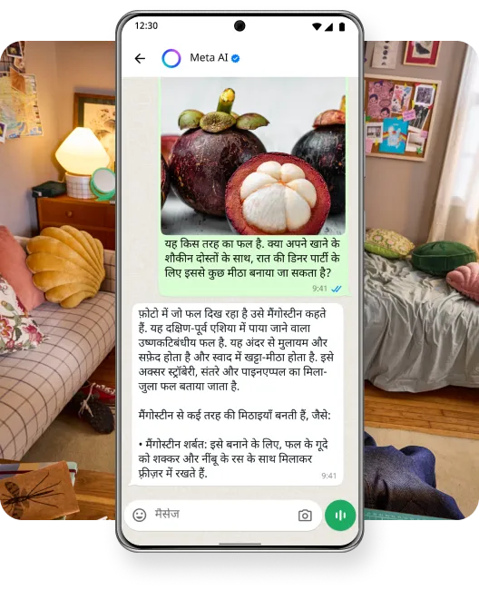 टेक्स्ट या वॉइस प्रॉम्प्ट के ज़रिए Meta AI से मदद पाएँ —फिर चाहे, आपको गणित का सवाल हल करना हो, फ़ोटो एडिट करनी हो या कोई ऐसा रेस्टोरेंट ढूँढना हो जहाँ जाने के लिए ग्रुप चैट का हर मेंबर अपनी सहमति दे सकता हो.