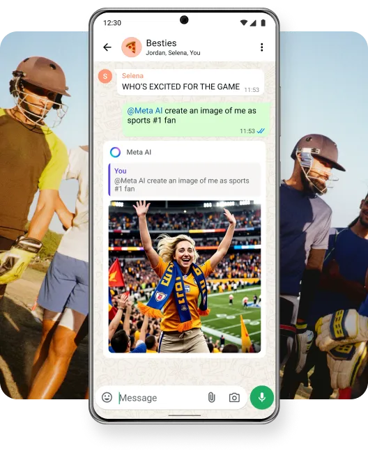 Meta AI를 활용해 아이디어를 실현해 보세요. 사진을 수정하거나 새로운 AI 생성 이미지를 만들어 그룹 아이콘으로 설정하고, 영상 통화 배경으로 사용하거나 대화에서 공유할 수 있습니다.