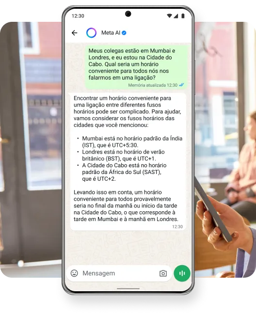 Seja para combinar o próximo encontro com seus amigos ou para criar e compartilhar imagens nos grupos, com a Meta AI é fácil receber ajuda para qualquer coisa. Tudo isso com a segurança e a privacidade do WhatsApp.