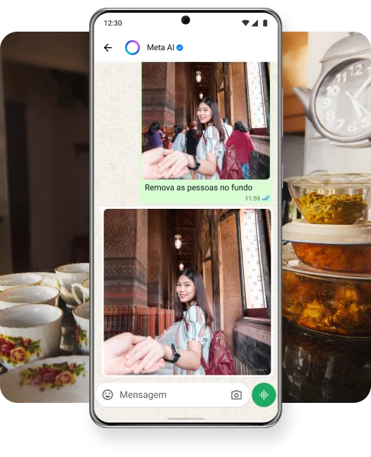 Dê vida às suas ideias usando a Meta AI para editar suas fotos ou criar novas imagens geradas por IA: seja para usar como imagem do grupo, definir como plano de fundo da ligação de vídeo ou enviar em uma conversa.