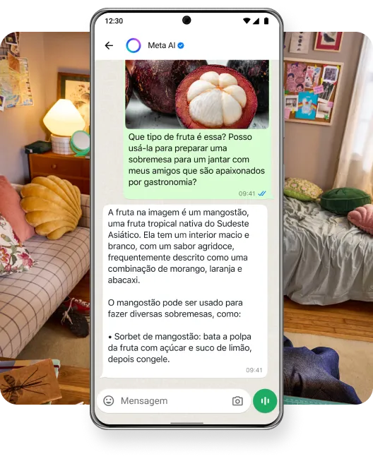 Receba ajuda da Meta AI para o que você quiser, por texto ou por voz. Seja para resolver um problema de matemática, editar uma foto ou encontrar um restaurante que todos do grupo gostem.
