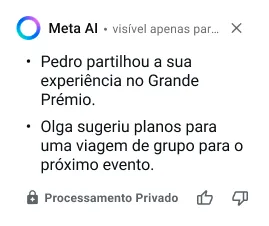 Quando as mensagens não lidas começam a acumular-se, a Meta AI pode ajudar a resumi-las rapidamente para que possa voltar à conversa. A tecnologia Processamento Privado permite à Meta AI processar as suas mensagens sem que a Meta ou o WhatsApp as possam ler.