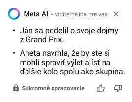 O používaní funkcií umelej inteligencie, ktoré máte k dispozícii v aplikácii WhatsApp, rozhodujete vy. Ako vždy platí, že vaše osobné správy a hovory sú chránené šifrovaním počas celého spojenia. V prípade funkcií, ktoré pracujú s vašimi osobnými správami, technológia súkromného spracovania umožňuje Meta AI generovať odpovede bez toho, aby si Meta a WhatsApp vaše správy čítali.