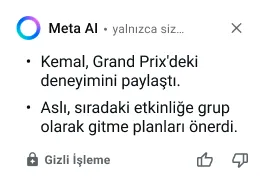 Okunmamış mesajlar birikmeye başladığında, konuşmaya bir an önce geri dönebilmeniz için Meta AI kaçırdığınız mesajları hızlıca özetlemenize yardımcı olabilir. Gizli İşleme teknolojisi, Meta'ya veya WhatsApp'a mesajlarınızı okuma imkanı vermeden Meta AI'ın mesajlarınızı işlemesine olanak sağlar.
