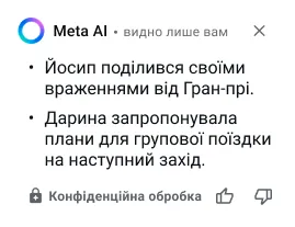 Коли непрочитані повідомлення починають накопичуватися, Meta AI допоможе швидко підсумувати їх, щоб ви могли легко повернутися до розмови. Технологія конфіденційної обробки дозволяє Meta AI обробляти ваші повідомлення так, щоб ані Meta, ані WhatsApp не могли їх прочитати.
