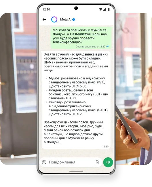Незалежно від того, чи ви віддаєте перевагу тексту чи голосу, Meta AI допоможе вам розвʼязати математичну задачу, редагувати фото або ж знайти ресторан, і обговорити це зі всіма учасниками групового чату.